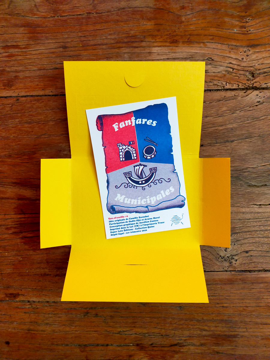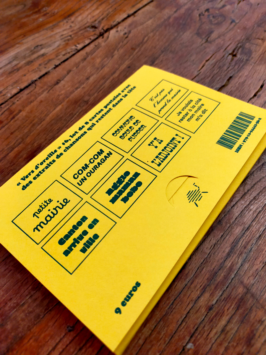 Super Loto éditions revient avec son concept de cartes postales musicales, les coffrets « Vers d’oreille » grâce auxquels on n’est plus seul·e à garder toute la journée un air entêtant. Pour l’année 2026, le thème des élections municipales est apparu comme une évidence. Quiconque habite de petits villages ne connaît que trop bien l’importance de ces scrutins et des airs joués par la fanfare pour les grandes occasions. À l’instar du coffret Élections : pièges à sons, ici encore le procédé poétique du jeu de mot est utilisé à tout va !