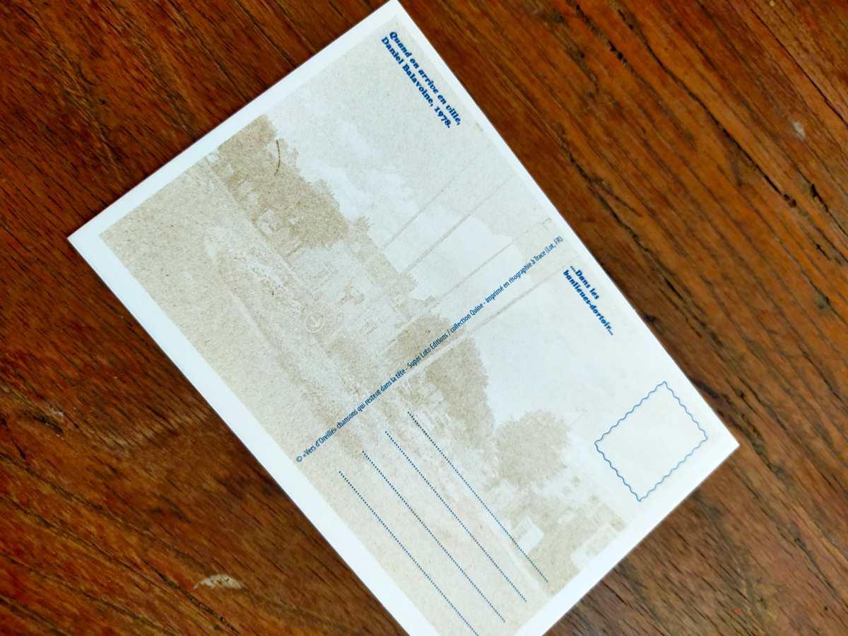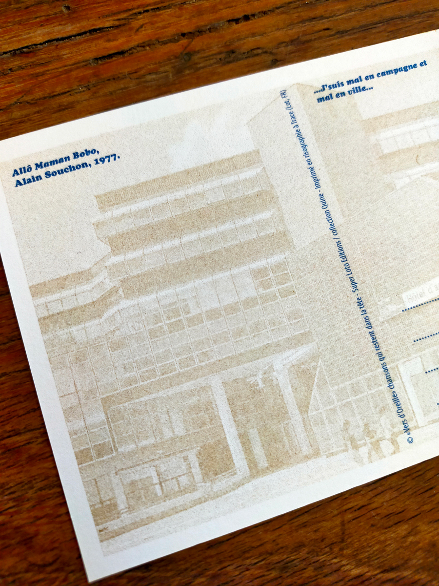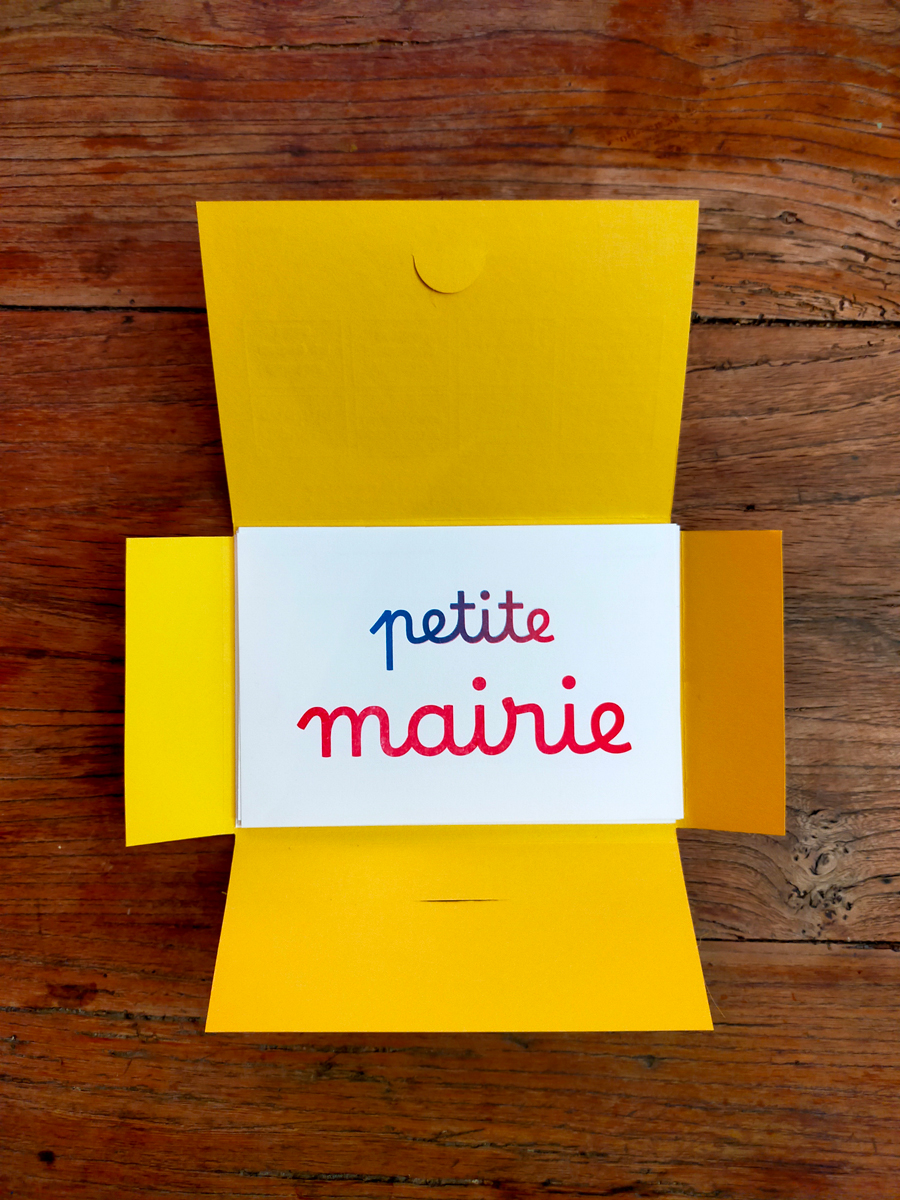 Coffret de 8 cartes postales, pochette imprimée en typographie (impression et découpe), et cartes postales en risographie 2 couleurs recto-verso.
